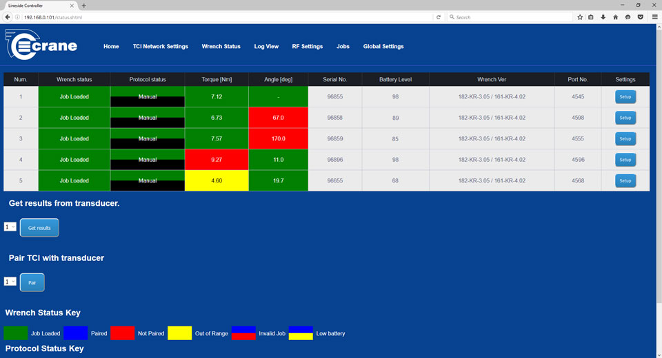 El TCI Multi tiene una página web de estado que permite monitorear las propiedades de Ethernet, las propiedades de RF, el registro de mensajes y el estado de la llave. La página web también refleja las últimas lecturas de par y ángulo de la llave además de su estado de par (LO, OK y HI). Las luces LED en la unidad TCI real muestran el estado en tiempo real de las conexiones de llave individuales.